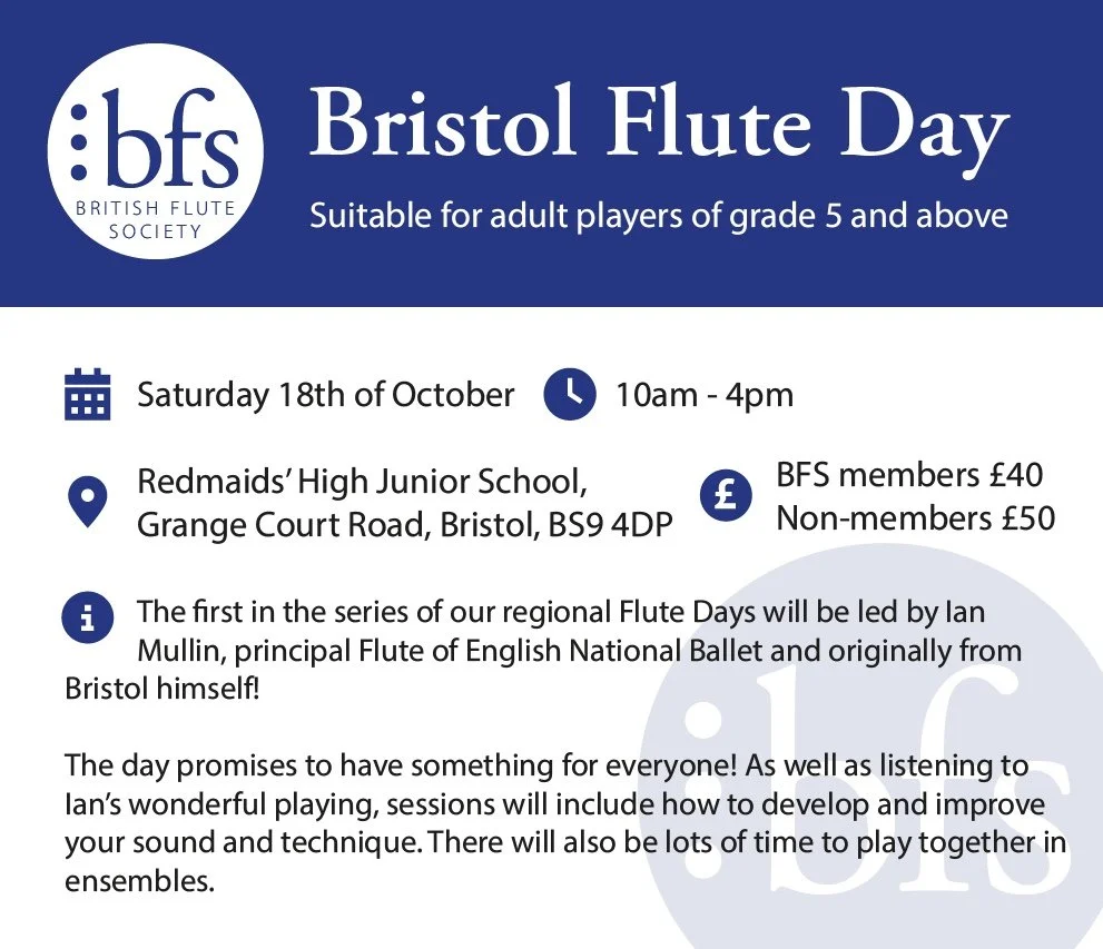 Our first event will be on Saturday October 18th in Bristol with the fantastic Ian Mullin, Principal Flute of English National Ballet and originally from Bristol himself!